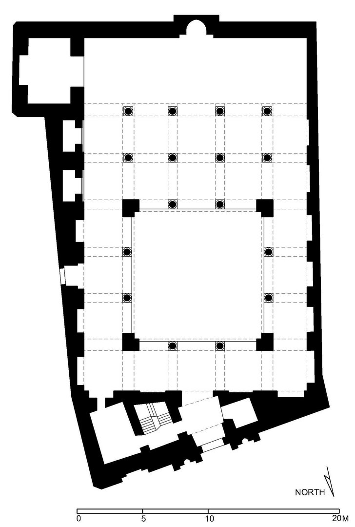 The brick minaret, along with restorations including the mihrab and minbar, was introduced by the Mamluk Amir Yalbugha al-Salimi in 1397.