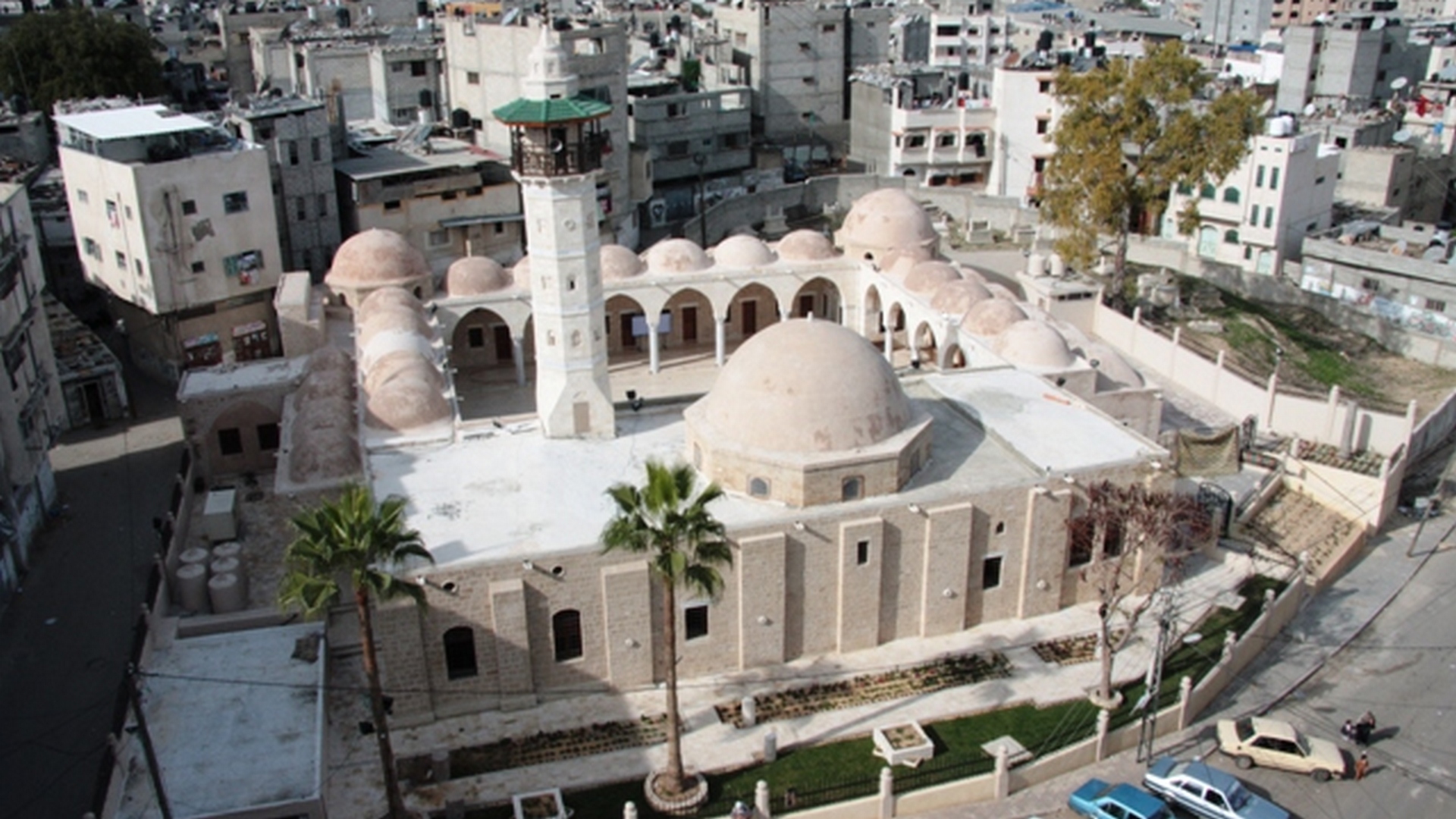 It is one of the most beautiful mosques in Gaza and one of the largest, which is an open area surrounded by four canopies, the largest canopy of the Qibla, and in the room that opens on the Western cloak is the tomb of Hashim bin Abdul Manaf grandfather of the Messenger of Allah Muhammad ‘Sala allahu alayhi wa sallam’. He died in Gaza during his summer journey. The mosque was established by the Mamluks and renewed by Sultan Abdul Majid in 1850 and named Gaza City “Gaza Hashim” after him.