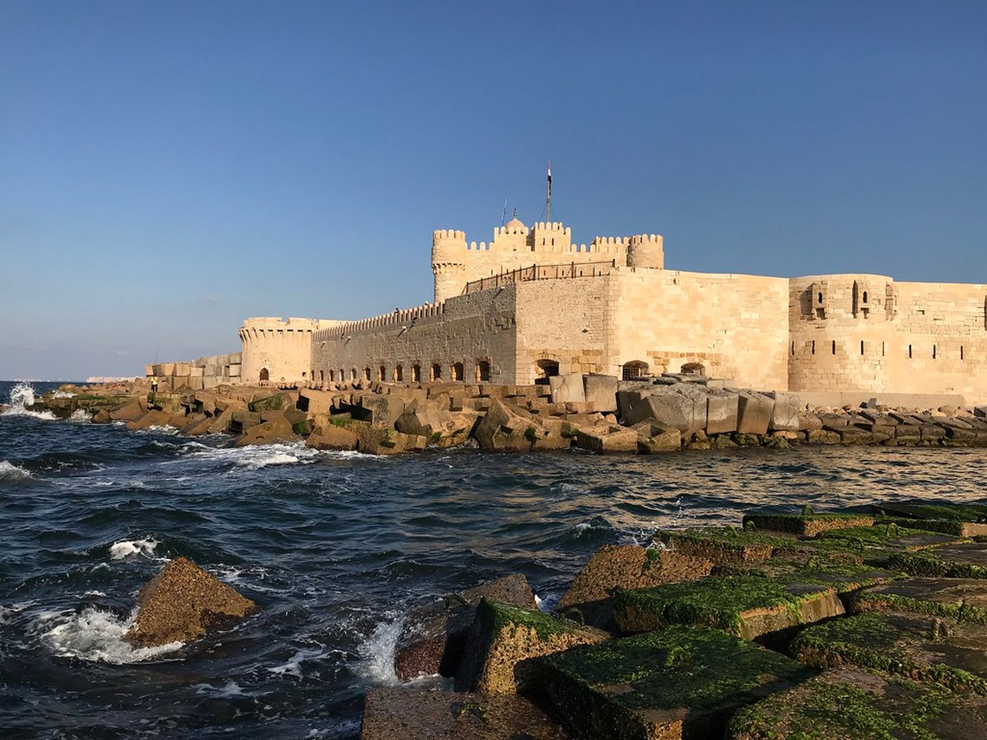 The Qaitbay Citadel is one of the most important examples of military architecture along the Mediterranean coast. It is an important Mamluk edifice of 15th century Alexandria, situated at the entrance of the eastern harbor of Pharos Island. The construction of the castle was ordered by the Mamluk Sultan Al-Ashraf Qaitbay, who strengthened the coastal defense buildings. Inside the citadel, he also ordered the construction of a mosque.