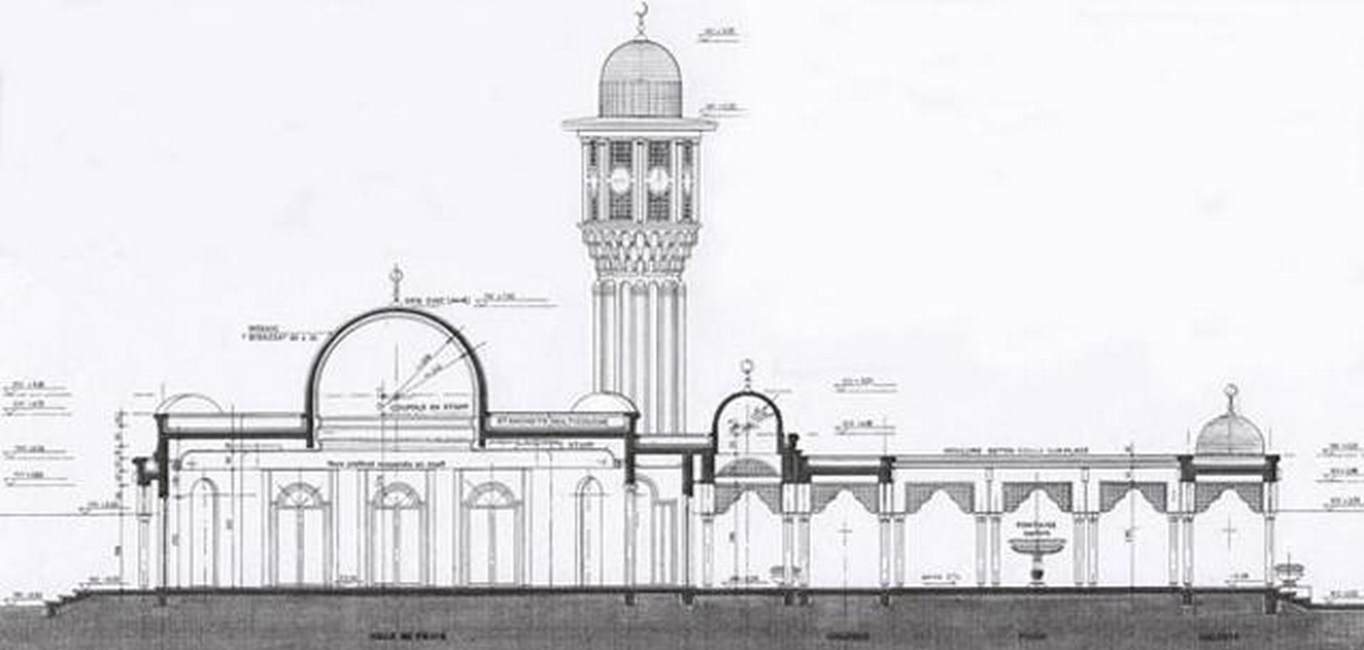 The mosque is composed of a prayer hall and a galleried court. The mosque has five domes covered with turquoise and copper mosaic.
