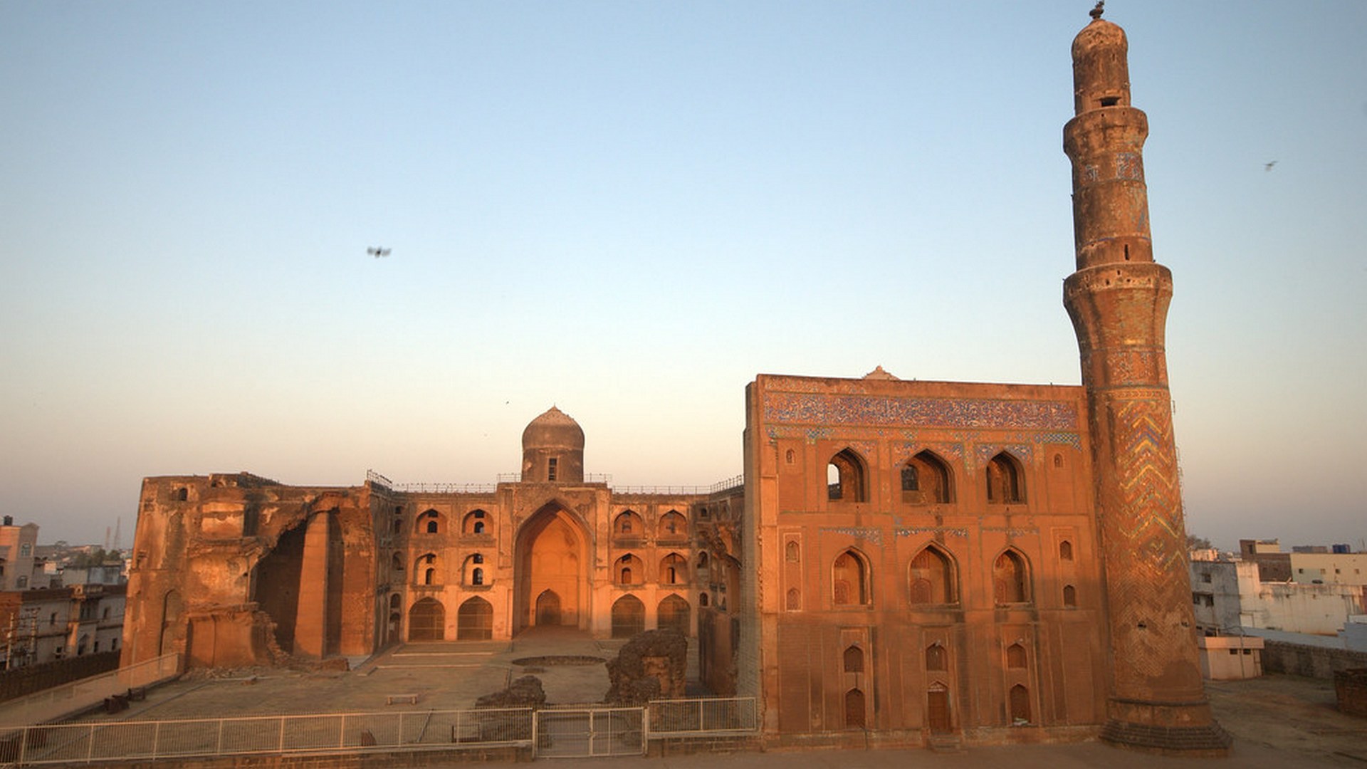The Persian influenced madrasa is established by Khodja Mahmud Gawan and had been an important educational center with a library consisting of over three thousand manuscripts. Although most of its decoration work does not exist today, the Persian style glazed tile work is recognizable. The structure was elevated on a base and had two decorated minarets. The madrasa has large reading halls with semi-octagonal chambers.