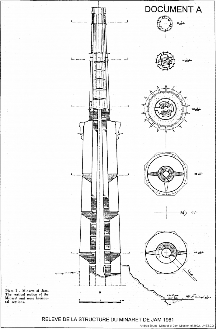 According to local sources, it is said that during the Ghurid period the Jam river was controlled by brick masonry walls flanking the stream 1 km upstream from the minaret. The stream was covered at its ends and constructions were built over it. There are traces of brick masonry foundations at the opposite site of the Minaret on the northern bank of the Harirud river, which according to Dr. A. Wasay Najimi, must be a foundation of a bridge leading access from the port of the walled settlement, at the northern side of the Harirud river, to the site of the minaret and the grand mosque/madrassa, now the platform grounds east and south of the minaret. Excavation are needed for further information (cf. Dr. A. Wasay Najimi’s mission report, 30 July- 8 August 1995, p. 3). In August 1963 a temporary dam of stone and timber was built to forestall the danger coming from the building’s structural instability: the minaret was markedly leaning towards the main stream below the Harirud river. This work was carried out with the help of nearby Jam village’s inhabitants. In June 1964, a work program was evaluated which consisted of the following: sample analyses of the bricks and their mortar; subsoil and foundation trial-tests; consolidating with “root-piles” their load-bearing capacity; restoring the structural and relief masonry brickwork and undertaking diverse archaeological test diggings in the immediate surroundings. The complexity and the variety of problems to be overcome in order to adequately restore the minaret made it impossible to accomplish the program within a brief period.