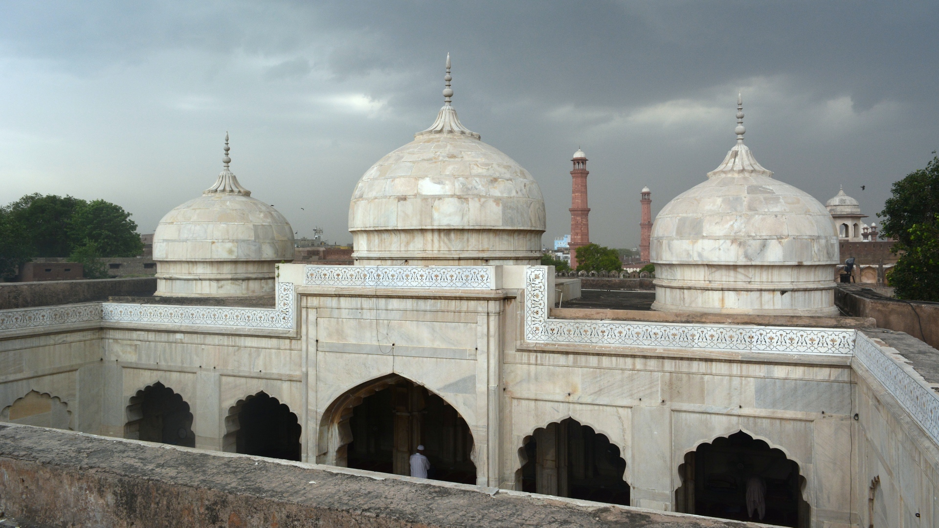 The Moti Masjid is located on the western side of the Lahore Fort, which is the only monument in Pakistan that represents the whole history of Mughal architecture. The masjid is entirely in white marble, with the cusped arches, engaged baluster columns, and smooth, fine contours associated with the style of many Shah Jahan’s buildings. It has two aisles of five bays, and a slightly raised central pishtaq, a portal with a rectangular frame.