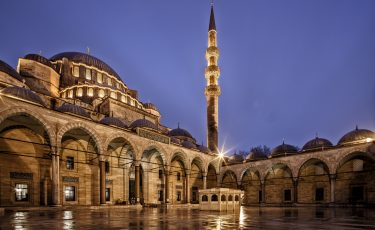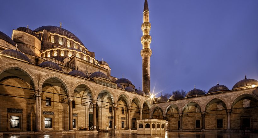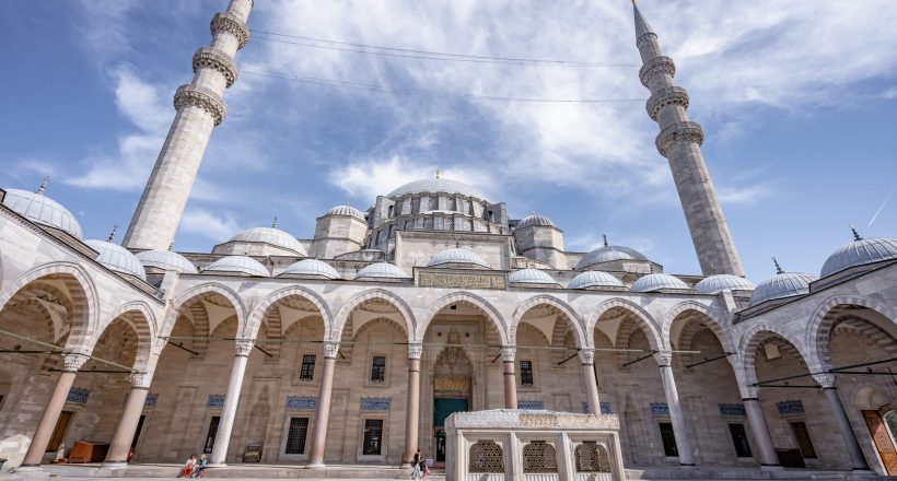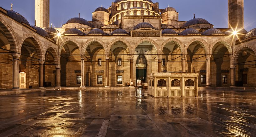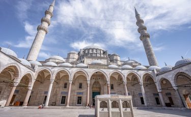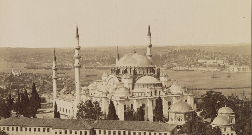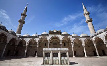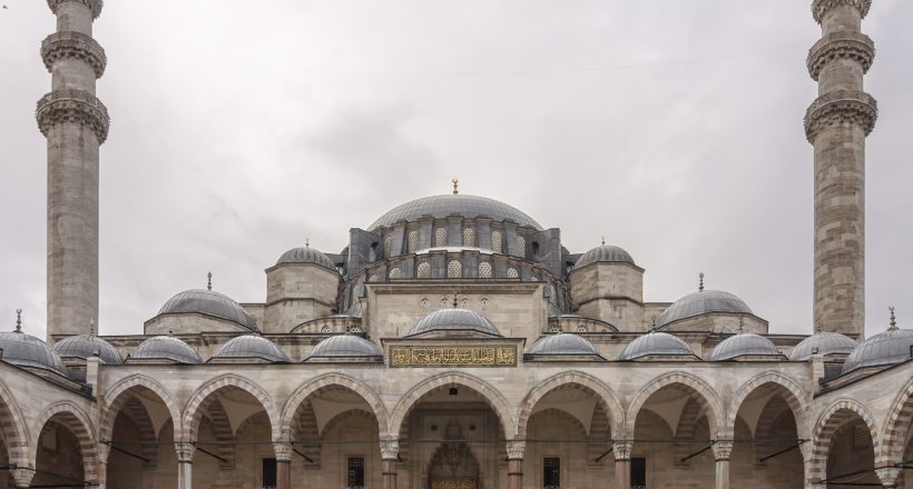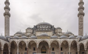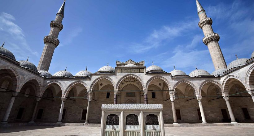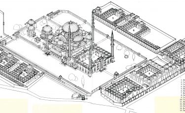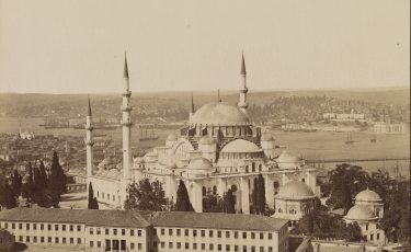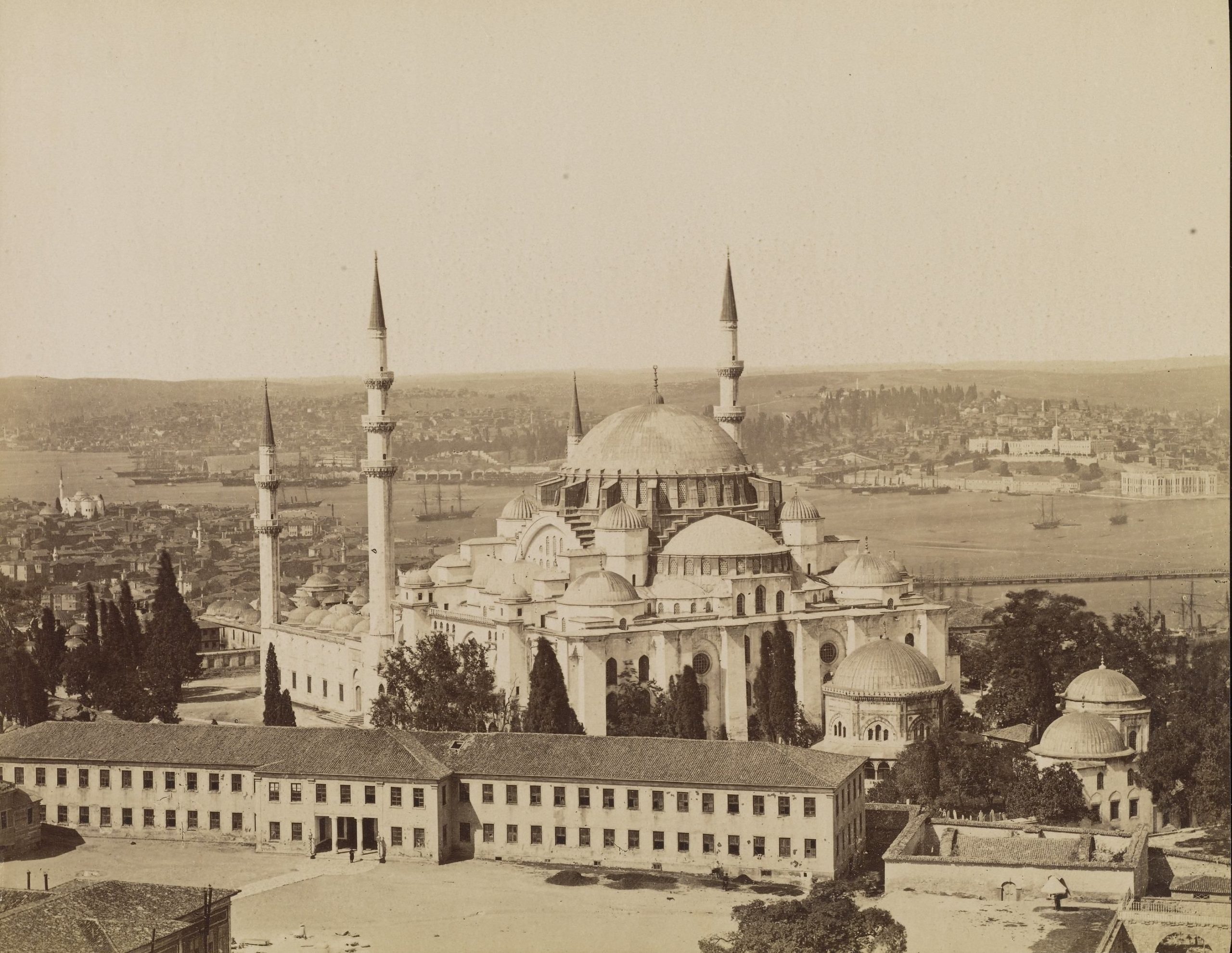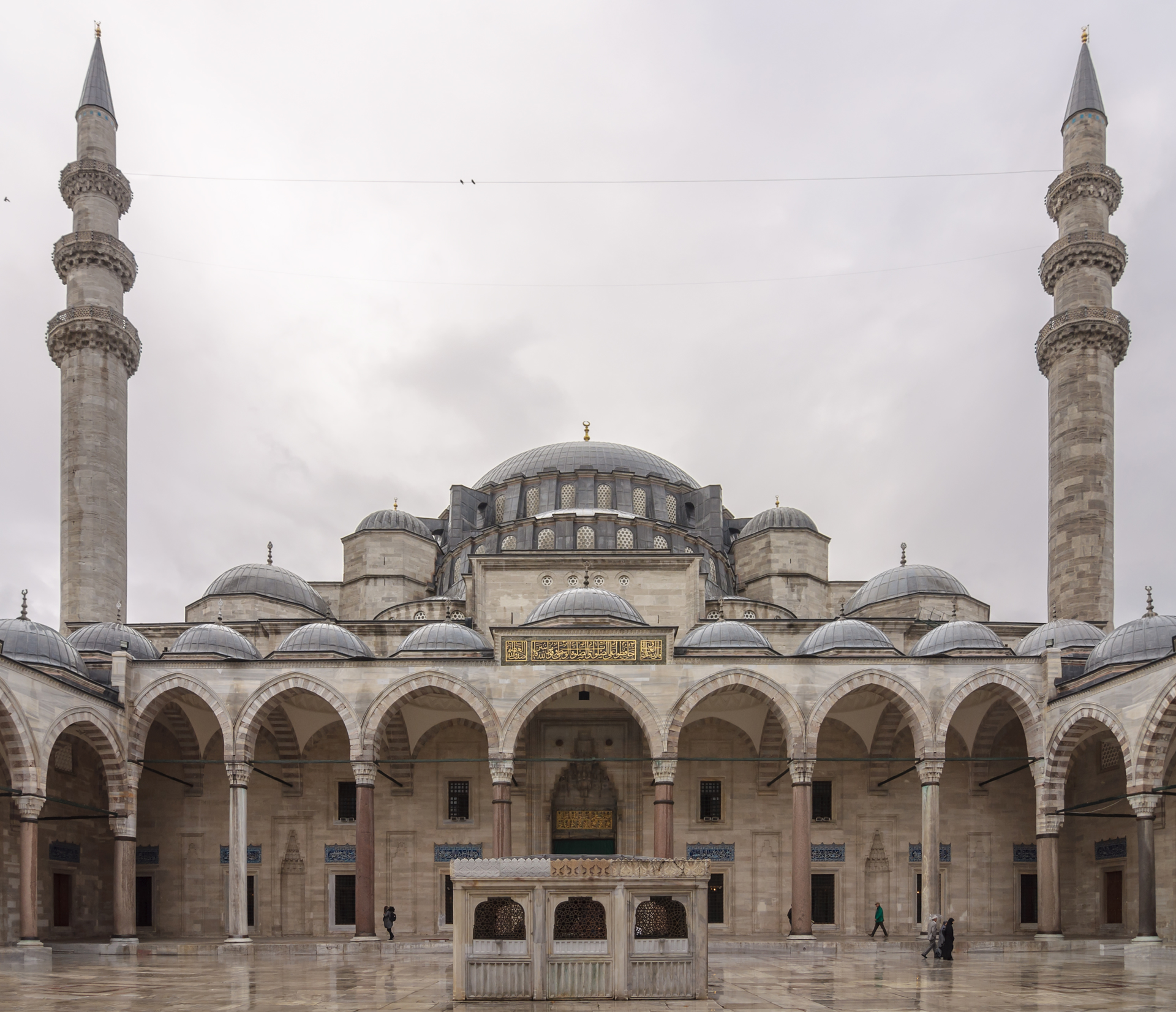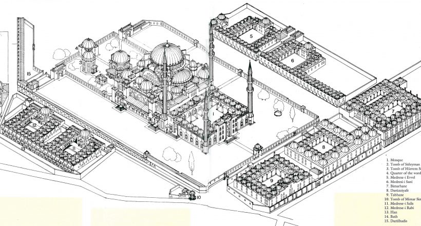 An inscription plaque on site dates the foundation of the building to 1550/957 AH and its inauguration to 1557/964 AH, although other documents make clear that certain buildings in the complex were not finished until 1559/966 AH.1 The complex includes a mosque, the mausoleums of Sultan Süleyman I and his wife Haseki Hürrem Sultan, four madrasas dedicated to the four schools of Islamic law, one madrasa dedicated to hadith studies, a Qur’an school, a medical school, a hospital, a hospice, a public kitchen, baths, and fountains. Finally, the architect was given a tomb on the grounds of his own design.