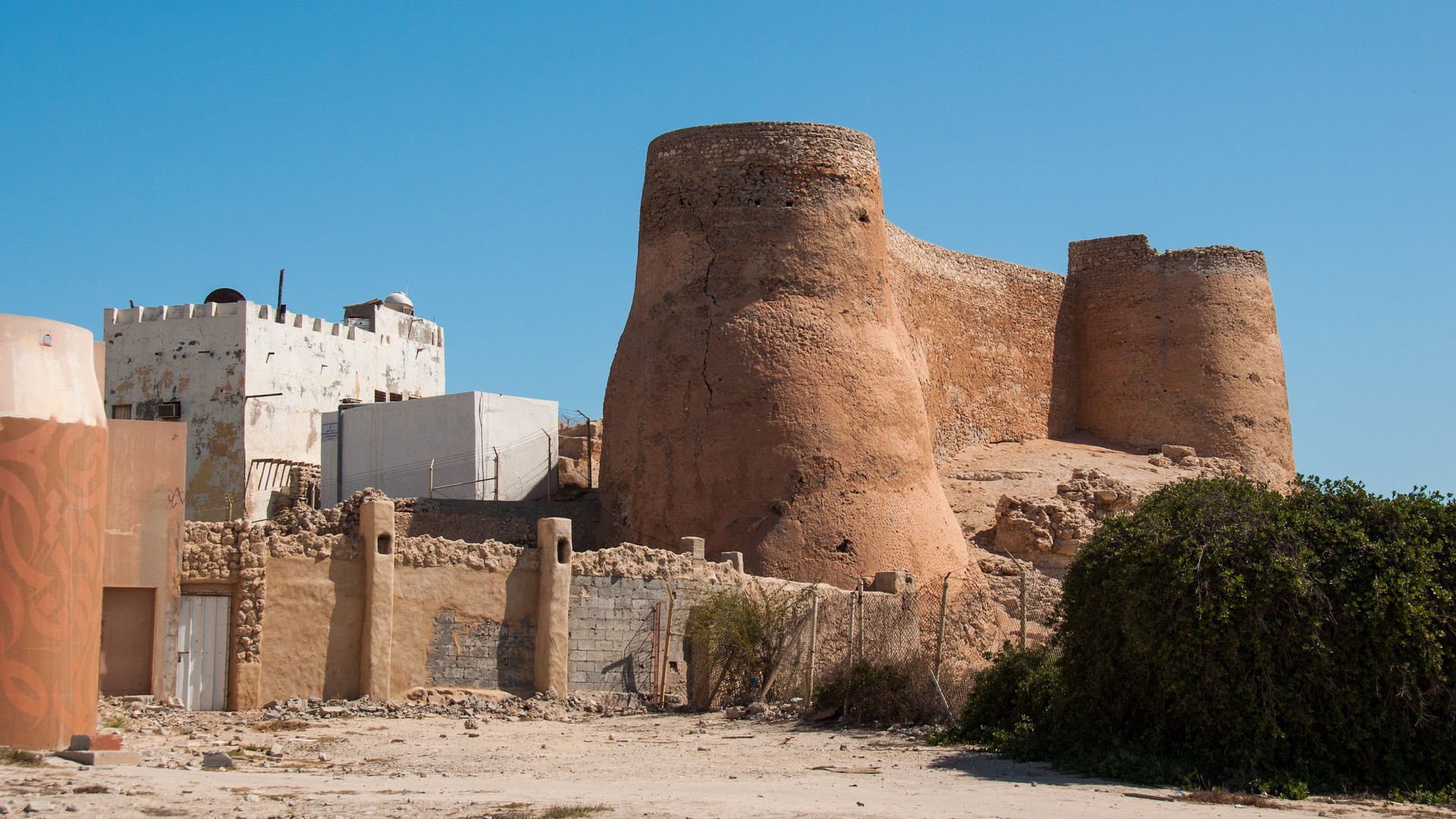 Semi elliptical non regular shaped castle with an external fence bolstered with four conical shaped tower two of which are still erected on the west side. Constructed during the 16th century BC on the remains of an ancient building with apparent rock foundations. The archaeological founds at the castle indicate that it belongs to four historical periods the oldest of which dated back to Al-Obaid era 4300 BC.