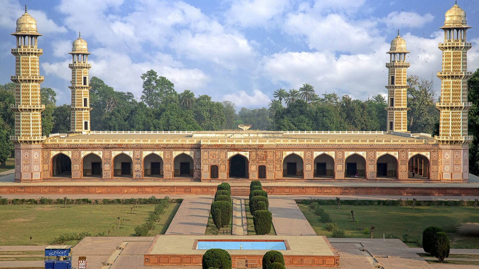 Located just outside Lahore, at Shadera, this tomb is set in an ornamental garden; there are paved causeways, canals and reflecting pools, with four entrance gateways of red sandstone. The long, low, arcaded structure has four octagonal minarets engaged at the corners, their shafts patterned with chevrons and crowned by domed kiosks. The central octagonal chamber is separated from the outer surrounding arcades by walls 19m thick. Over this central chamber, on the roof, is a square platform that once supported a marble pavilion, now destroyed. Decorative themes are worked in fresco, marble inlay and mosaic tiles, forming geometric patterns and panel designs of flower vases, whose origins are distinctly Iranian. The marble cenotaph is one of the finest in India with inlaid semiprecious stones set in naturalistic floral designs and calligraphy inscribing the Ninety-Nine Names of God.